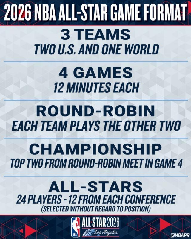 比赛将组建2支美国队和1支世界队,每队由8名全明星球员组成。三队将进行组内单循环赛,共计4场比赛,每场比赛时长为12分钟。组内循环赛结束后,战绩最佳的前两名队伍将晋级决赛,争夺最终冠军。