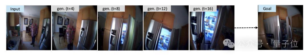 比如,PEVA能够通过感知环境,排除第一行“打开水槽”和第二行“走到户外”的动作序列,找到第三行“打开冰箱”的合理动作。