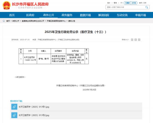 8 月 23 日,记者从长沙市开福区人民政府官网获悉:长沙市开福区针对此案件共立案 4 起,均下达行政处罚决定书,对涉案 5 人作出行政处罚。其中,两名开办者被没收涉案药品器械、没收违法所得 167.9 万元,罚款 2518.5 万元;一名医生被警告、没收违法所得 11.75 万元,罚款 3 万元,暂停执业活动一年;一名护士被没收违法所得 6 万元;一名实验室人员被没收违法所得 1 万元。