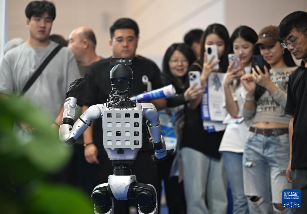 9月17日,参观者在展会现场观看一款人形机器人表演。新华社记者 赵子硕 摄